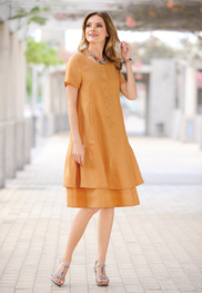 身頃の裏地に綿素材を配した、着心地のよい麻ワンピース。後ろ姿はタックを入れたティアード調の切替えデザインがアクセントに。