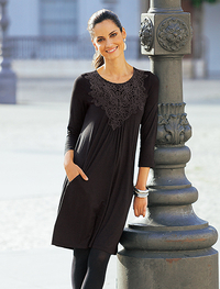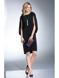 前身頃から後ろ肩にかけてレースをあしらったブラックワンピース。ベーシックなシルエットなので、合せる小物次第でシックにもゴージャスにも演出できます。