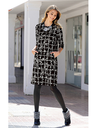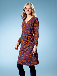 上身頃のニットにチェック柄のスカートを合せたようなラップ風デザインのワンピース。カシュクールの衿元がエレガントです。