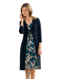 一枚で魅力的なコーディネートが完成。ワンピースの上にカーディガンを重ね着しているように見えるデザインです。