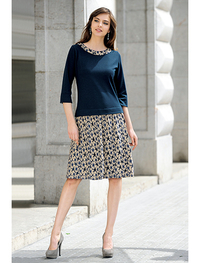 上部はほどよく厚みのあるポンチジャージー、スカート部分は上品な表面感があり、ストレッチの効いたフクレジャカード。