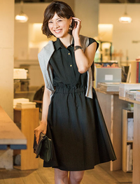 袖口のタックとウエストのリボン風デザインがフェミニンなムードを演出。高めのウエスト切替えが腰高に見せてくれます。