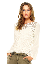 前身頃は透け感のあるレース素材、後ろ身頃は爽やかな布帛の異素材使い。チューリップ袖が可愛いアクセントに。