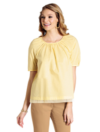 衿とフロントのタックプリーツにシフォンを切替えたきちんと感のあるジャージートップ。ジャージー部分は汗じみ防止機能付だから汗ばむ季節にぴったり。