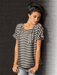 しなやかな素材感とドレープ性のある素材で、定番ボーダーをひと味エレガントに。袖口タブに小さなシルバーボタンのアクセントを効かせた、ほどよいゆとりのドルマン風シルエット。