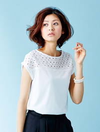 ジャージー部分に汗じみ防止機能がついたデザイントップ。胸元の幾何学レースがアイキャッチなのでジャケットインにもおすすめです。