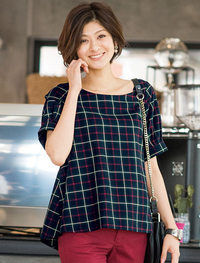 さらっと着られるチェック柄のコットンブラウス。脇のフレアーと後ろの長いデザインで、体型カバー効果も期待できる優秀な一枚。