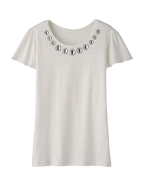大小のビジューがコーディネート全体を華やかに演出。ウエストインスタイルにも合せやすい長め丈です。