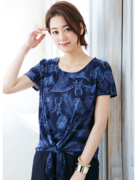 総柄のプリントが夏らしい雰囲気を表現。裾のリポンがアクセントになっていて体型もカバー出来る万能トップス。