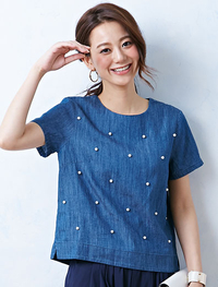 フロント部分にパールを散りばめた半袖プルオーバー。生地は4.5OZのデニム生地を使用した、軽くて薄い夏にピッタリのアイテムです。