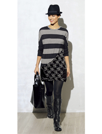 トップ調グレー地を濃淡使いにし、ボーダーと千鳥柄をアレンジ。アシンメトリー切替えや前後でちがう柄使い、フェイクレザーポケットなどユニークなディテールを楽しんで。