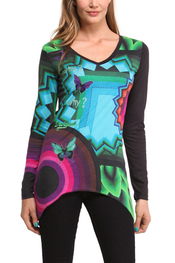 華やかなミックスプリントに蝶が羽ばたくデザインです。イレギュラーヘムで体型カバー効果も。