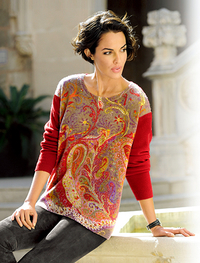 ちょっとゆるっとしたシルエットのセーターは、前身頃にはペイズリープリント、後ろはボーダー柄のコンビ使い。