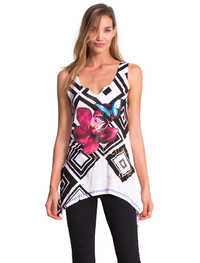 ジオメトリック柄に美しい蘭の花と蝶を彩ました。モノトーンベースなのでコーデしやすいチュニックです。