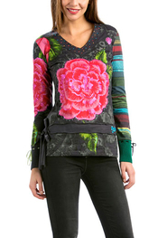 大きな花のイラストを配した大胆なデザインのチュニック。ウエストと袖口のリボンがポイントです。