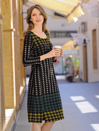 伸縮性のあるフクレジャカードを使用した人気の千鳥柄ワンピース。美シルエットに衿ぐりのパイピングでアクセントを。