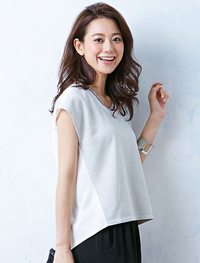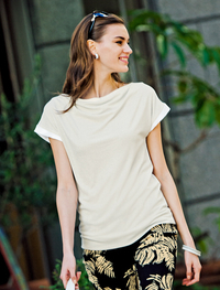 特殊紡績手法により、吸水性が高くサラッとした風合いで涼感を感じられる「レリア」を使用。ドレープの綺麗なメッシュネックがエレガント。