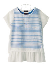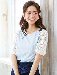 袖のレース使いに女性らしさを感じさせるデザイン。身頃はストライプの柄でカジュアルにもフエミニンにも感じさせる万能トップスです。