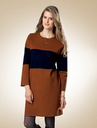 変形ボーダーに個性が光るニットワンピース。スカート部分を無地のニットで切替えて、女性らしいフレアーシルエットにしました。