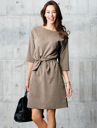 淡い色調で描いた羽モチーフのプリントが、優しい雰囲気をかもしだして。左脇にタックをとったアシンメトリーなドレープが美しいシルエットをつくります。
