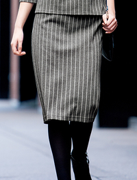 クラシカルな千鳥柄ジャカードを使い、前裾のアシンメトリーなデザインで遊びを添えたラップ風スカート。ストレッチ性のある生地で動きやすいのも魅力。