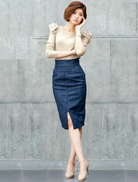 やや薄手のインディゴデニムを使用したハイウエストスカート。すっきりタイトなシルエットながらストレッチ性があるので着心地も快適です。