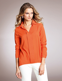 暑さの残る初秋にさらりと着られる、プルオンタイプのオープンカラーブラウス。前裾はダーツを入れてすっきりと。