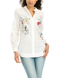 コットン地に小花の総刺しゅうを施した、繊細な素材使いが魅力のブラウス。前立てや台衿、カフスにもダークグレーのグログランテープを付けた凝った仕立てです。