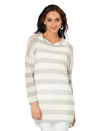 ソフトな肌触りのジャージー素材に、細見せ効果のあるV字ボーダーと細ボーダーをあしらいました。お揃いのスヌード付きなので着こなしのアレンジが自在です。