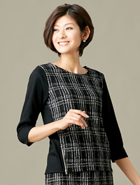 もこもこした表面感と味のあるメランジカラーにこだわった、ワンランク上のジャージー素材。ブラウスを重ねたような異素材デザインは、きちんと感も魅力です。