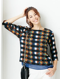 カラーを重ねたニュアンスのあるチェック柄が個性を発揮。裾からのぞくネイビーのシフォンは体型カバーにもひと役買ってくれます。