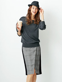 トレンドのグレンチェックが大人っぽい雰囲気のラップ風スカート。両サイドのラインとスリットの効果で美脚も狙えます。