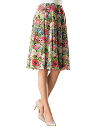 レースに鮮やかな多色使いの花柄をプリント。シンプルなトップと合せても華やかに。ウエストはゴム仕様ではきやすさ◎。