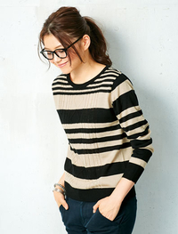 ケーブル柄とボーダーを重ねた今年らしいデザイン。すっきり着られる薄手ニットで初秋から活躍します。大人っぽいシックな配色も魅力。