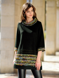 マルチボーダーのジャージーチュニックとタートルネックの重ね着風デザイン。しっかりと厚みがある、裏起毛のジャージー素材。