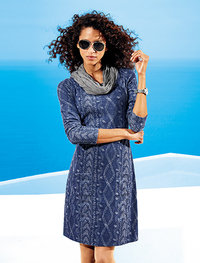 ニット柄のプリントがユニークなデザイン。裏パイルのストレッチジャージー素材で楽な着心地ながら、1枚でサマになる頼れる時短ワンピース。