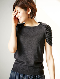 短め丈のボックスシルエットで、全身バランスがすっきり見えます。横に広い衿ぐりが首から鎖骨のラインをきれいに演出してくれるのもうれしいポイント。