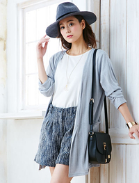 接触冷感素材「レリア」を使用し、ドレープを効かせたエレガントなカーディガン。ジョーゼット調の生地と細リブ生地を組合せた、鮮度の高いデザインです。