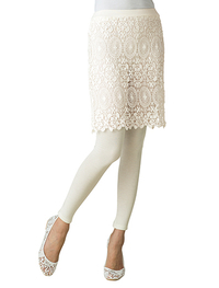 大柄のきれいなレーススカートとレギンスがドッキング。レースの透け感を楽しめるデザイン。気になるヒップもさりげなくカバー。