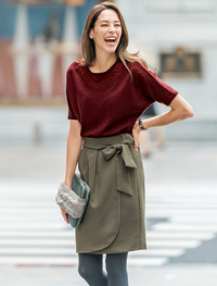旬のラップ風デザインを取り入れたミニスカート。後ろウエストはゴム仕様なのではき心地も抜群です。暖かみのある日本製ウール混素材で季節感も◎。