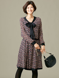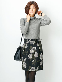 華やかな大きめの花柄ながら、シックな色合いで大人っぽい着こなしに。ふんわりとボリュームのあるシルエットもフェミニンな印象です。