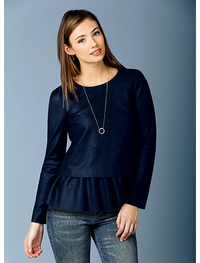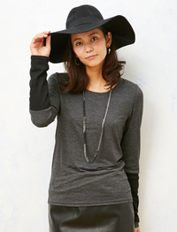 ジャージー素材にフロントのみふんわりとシフォンを重ねたトップス。シフォン部分にタックを入れて、表情に変化をつけています。