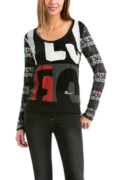 アルファベットを個性的にちりばめてデザインしたトップ。裾のリブ使いで大人の印象に。