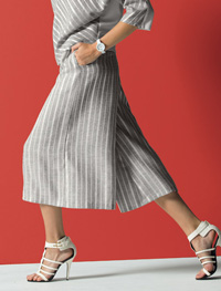 ほどよいボリュームで着こなしやすいスカーチョを、上品な光沢感のあるストライプ生地でクラスアップ。合せやすく今年らしい万能ボトムです。