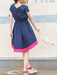 ドロップショルダーのちょうちん袖が大人かわいいジャージーワンピース。ポケットには配色のフェイクレザーを使用してワンポイントに。