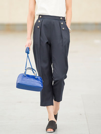 麻混なのにストレッチ、ピンストライプなのに女らしい、大人にぴったりのワイドパンツ。ウエストはゴム入りながら、前中心をすっきり仕上げました。