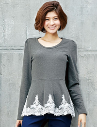 肌触りのよいジャージー素材を使用した切替えデザイントップ。裾にあしらわれた刺しゅうレースが高級感をプラス。