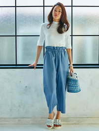 落ち感のあるストレッチ素材でつくったワイドパンツは、トレンド感はもちろん、脚長・ほっそり効果も抜群。
