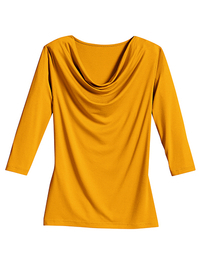 落ち感のよいジャージー素材を活かした、ゆるやかなドレープネックがエレガント。一枚で着ても、ジャケットインにも着映えする7分袖ジャージートップです。