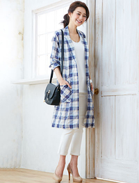 エスニック調の格子柄が印象的なカーディガン。大き目の襟とウエストから広がる長めに着丈が絶妙のバランスです。